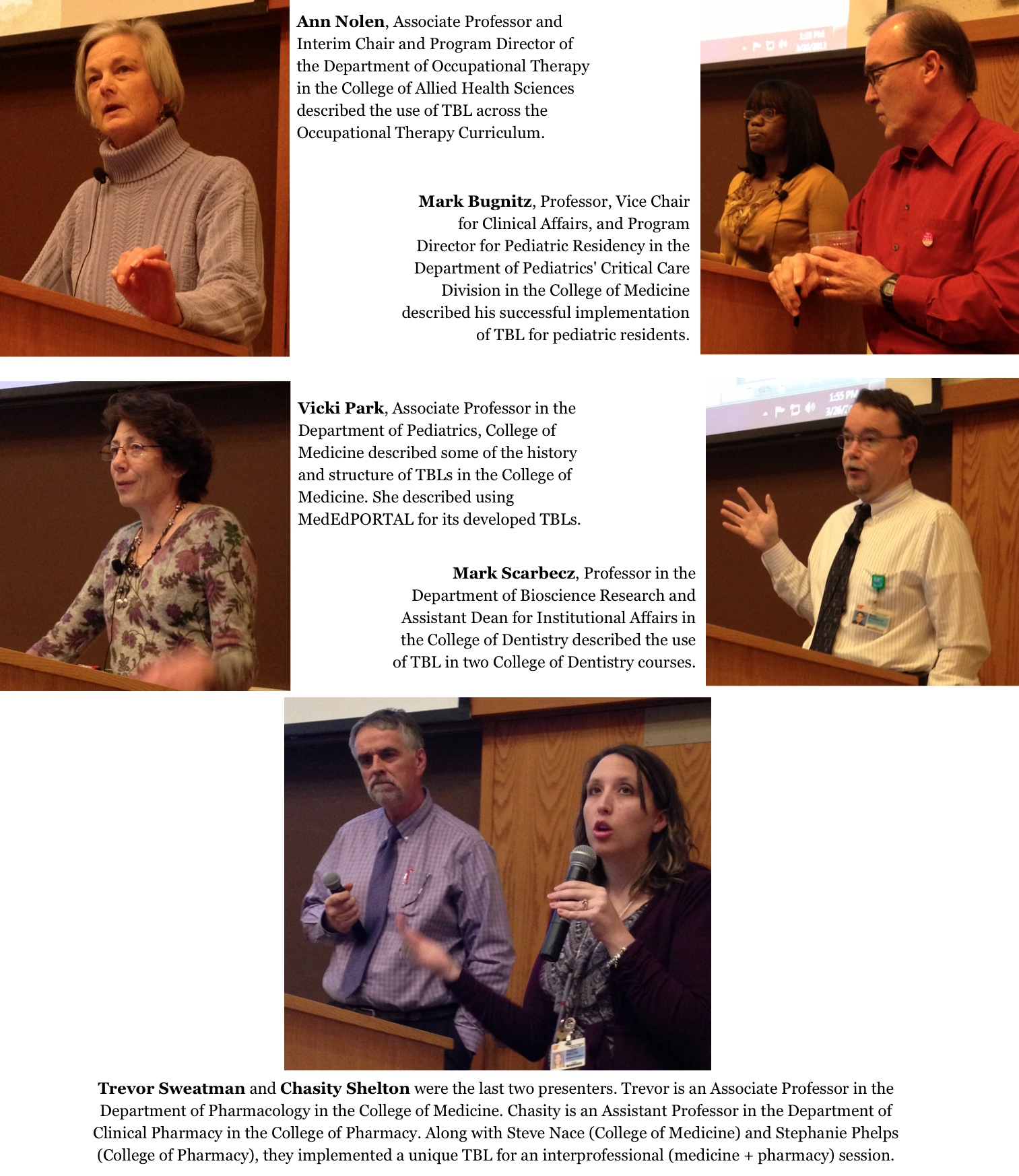 Faculty from 3 colleges presented on the use of TBL with specific courses and groups of learners, from 1st year through residency training. Access the MediaSite recording of the college presentations here.