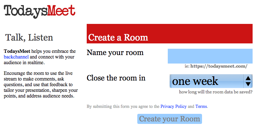 Tools, such as Today’s Meet, make it possible for instructors to create virtual chat or backchannel areas that students can use during class to ask questions or contribute their thoughts on the topic being presented. Instructors can assign specific students to monitor the chat area. At designated times during the class meeting, the student monitors can pass along questions or thoughts to the instructor that have been posted to the chat/backchannel area. This gives all students a chance to participate in the class discussion. It also provides a documented log of questions and thoughts shared during class that instructors can review afterwards and provide necessary responses or feedback for to students. The documented conversation also allows instructors to pinpoint specific topics presented during class that students might have struggled with in comprehending.