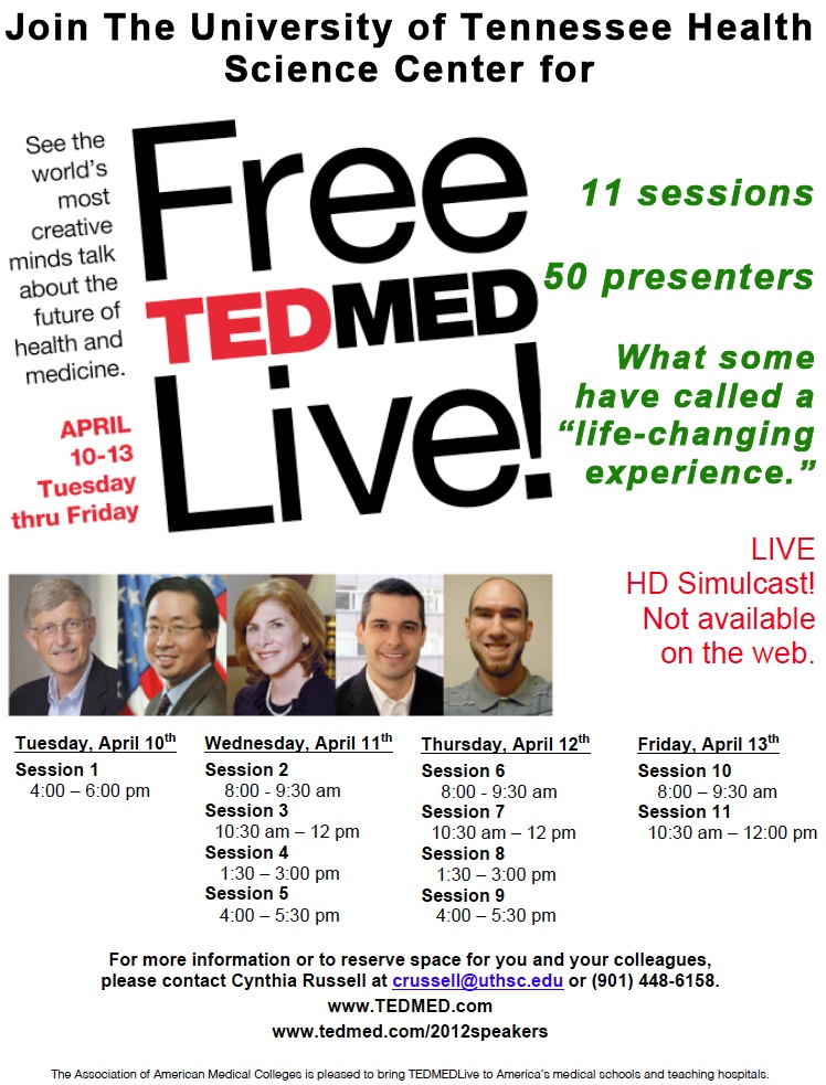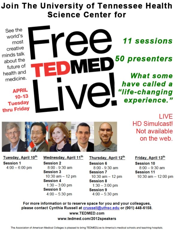 Great Talks has compiled some of the best posts from Tuesday’s session and UTHSC is mentioned – find it here http://paper.li/sansfront/1294843801#!tag-tedmed